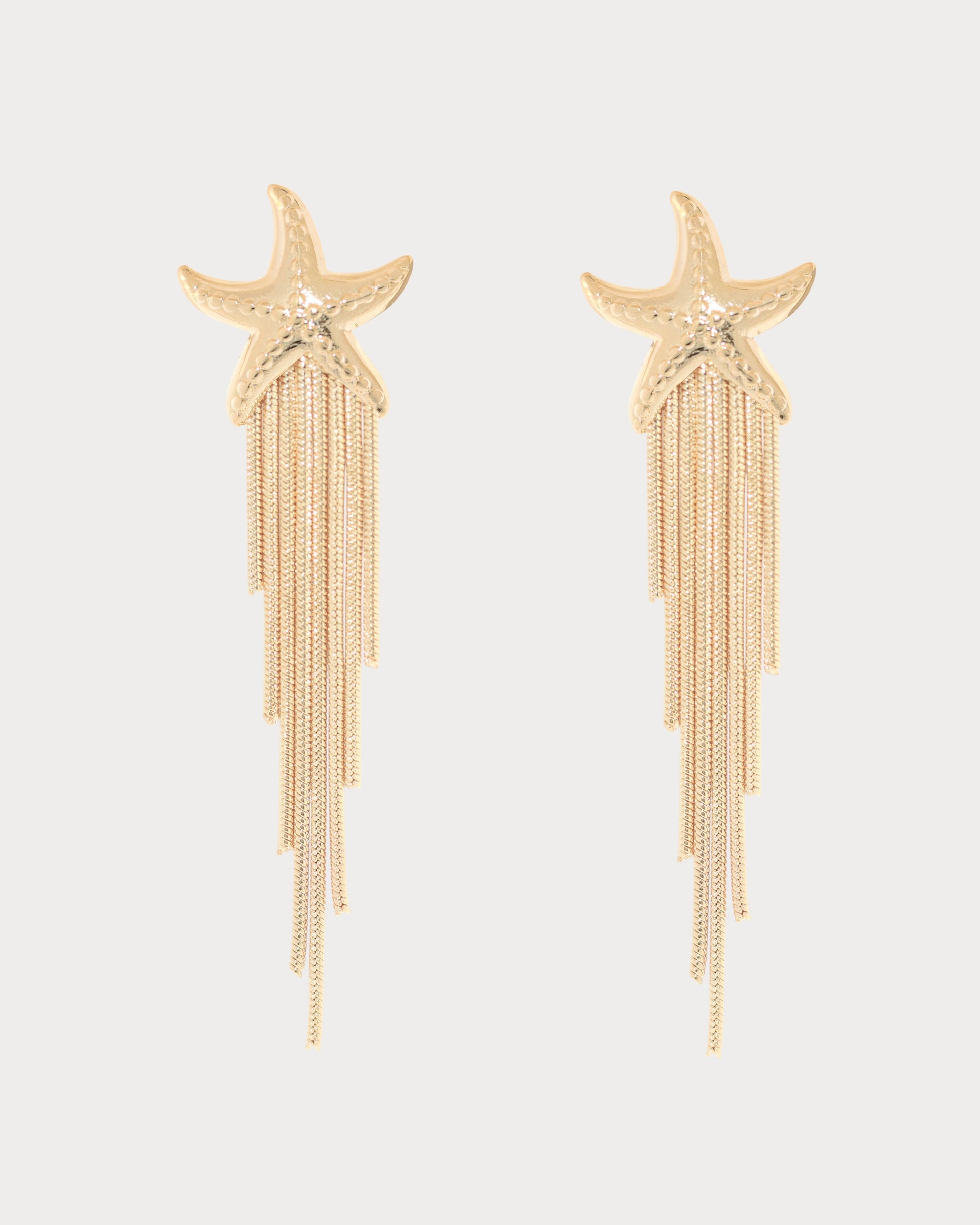 Our Artemis earrings give a flare of iridescence with every move. These earrings combine a minimalist starfish stud with cascading, delicate strands that create a flowing design.these earrings are sure to compliment any dress on a night out.