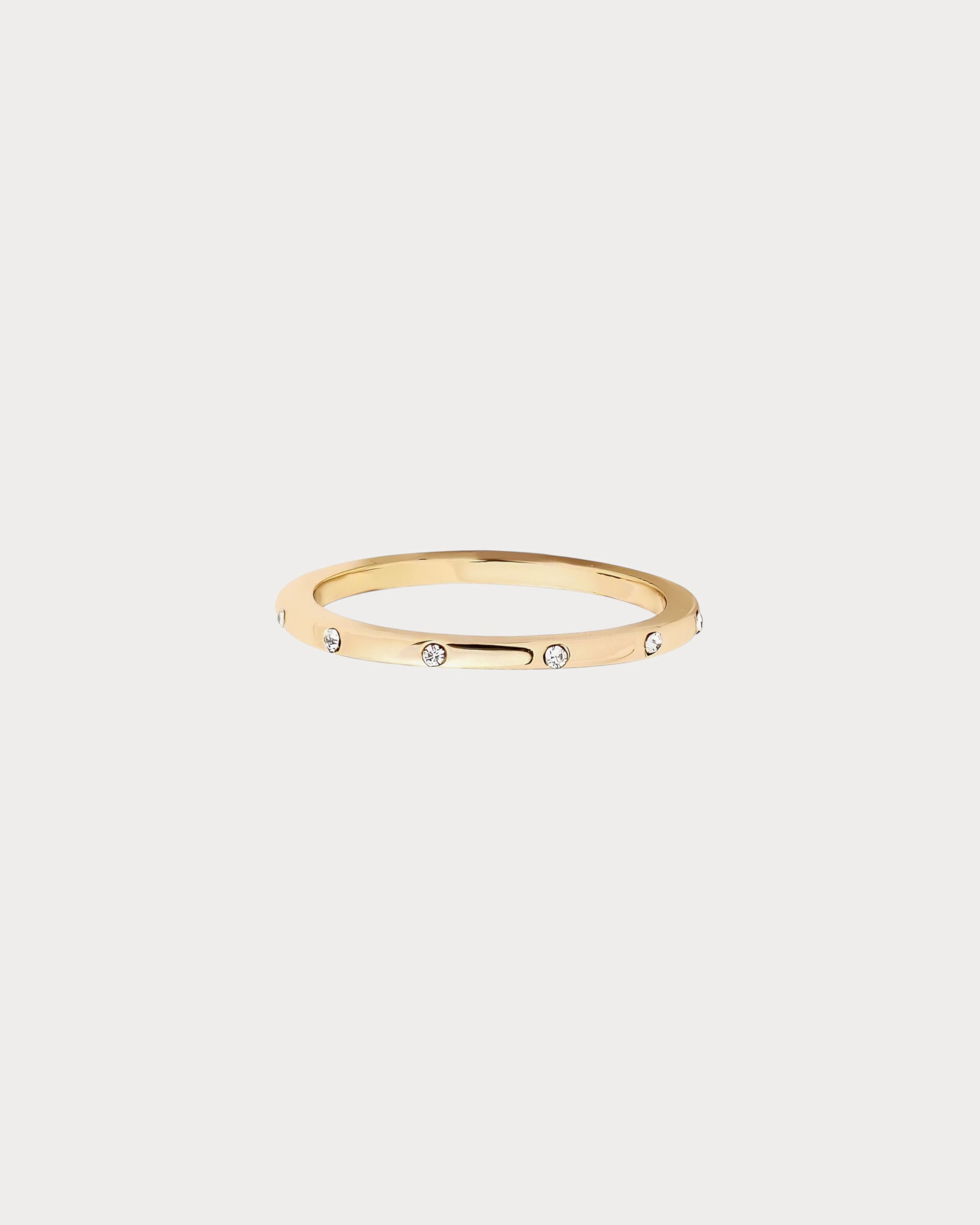 This ring features a series of radiant diamonds set in sleek, minimalist bezels that elevate the overall aesthetic. The bezel setting enhances the diamonds' brilliance while providing a modern, secure frame for each stone. Perfect for adding a touch of elegance to any outfit, this ring offers a timeless and versatile look.