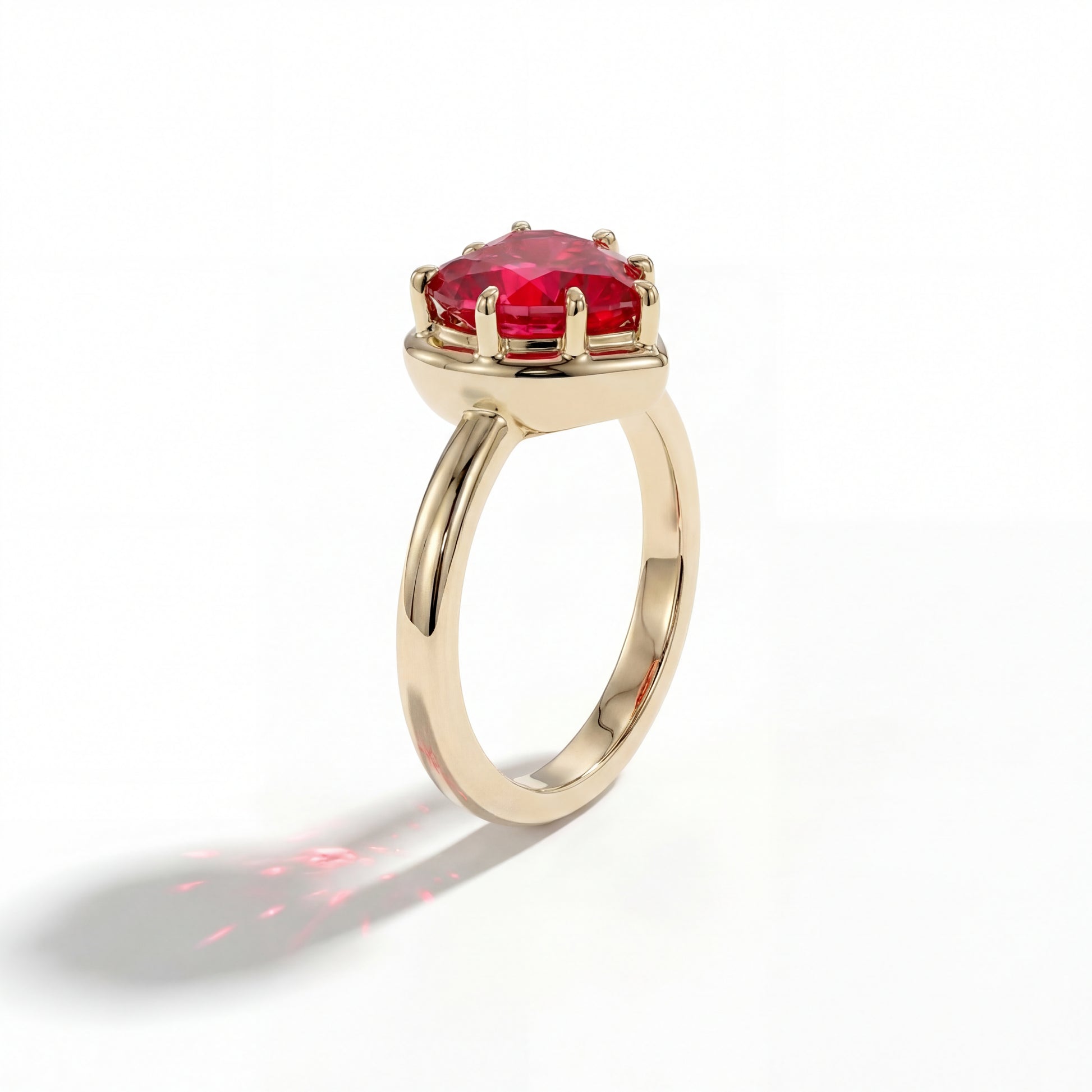 This ring is centered on a 4.5 carat heart-shaped ruby, set low and close within a sculpted gold mount that follows the contours of the stone precisely. The heart silhouette is pronounced yet controlled, its proportions balanced so the ruby feels substantial without exaggeration. Prongs rise naturally from the setting, securing the stone while remaining visually integrated into the form.