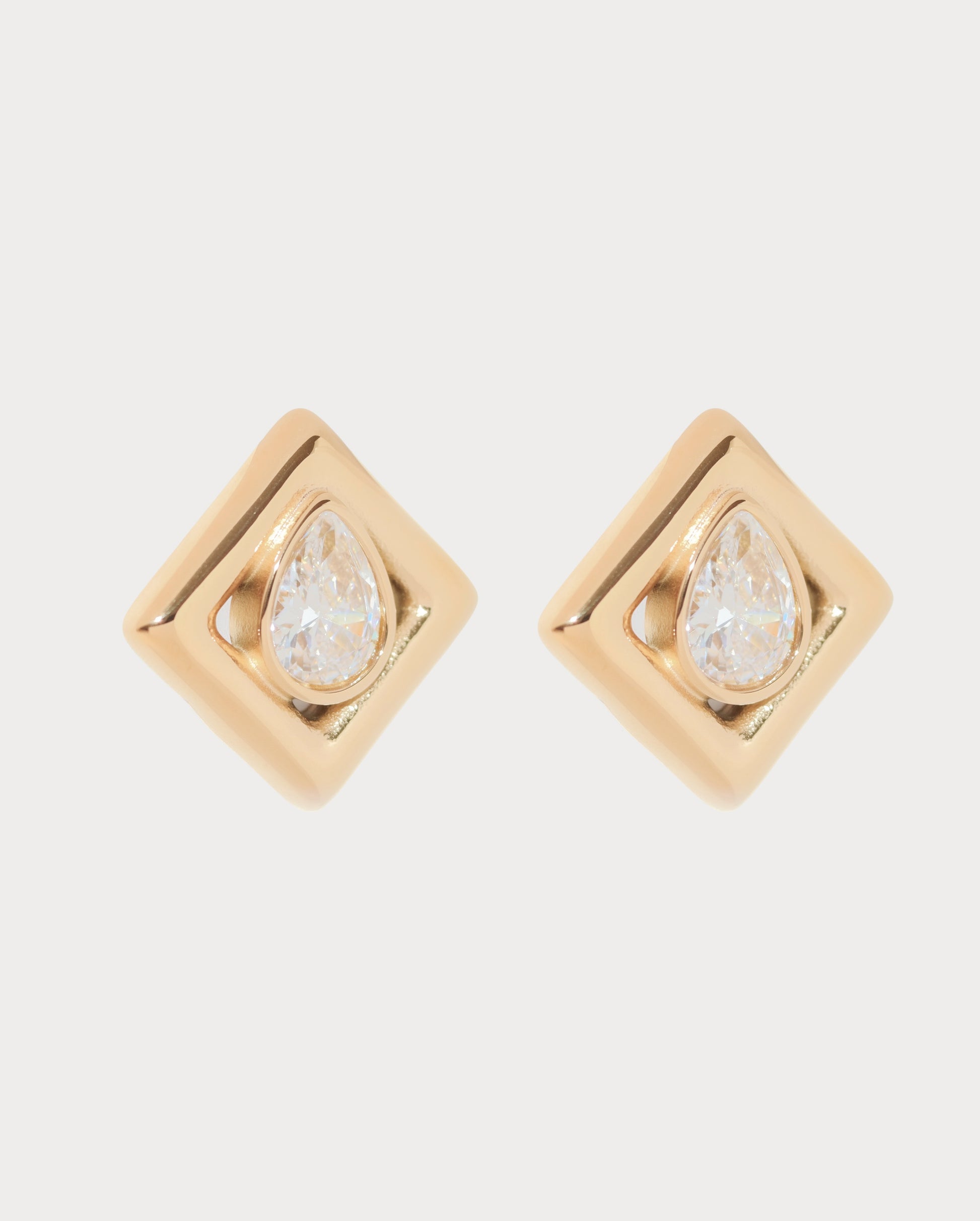 These wonderful earrings feature a refined and contemporary design, highlighted by a stunning droplet-shaped CZ diamond at the center. The square frame offers a sleek, modern silhouette, while the diamond adds a touch of brilliance and sophistication. The combination of the geometric shape and the delicate diamond creates a perfect balance of boldness and elegance.